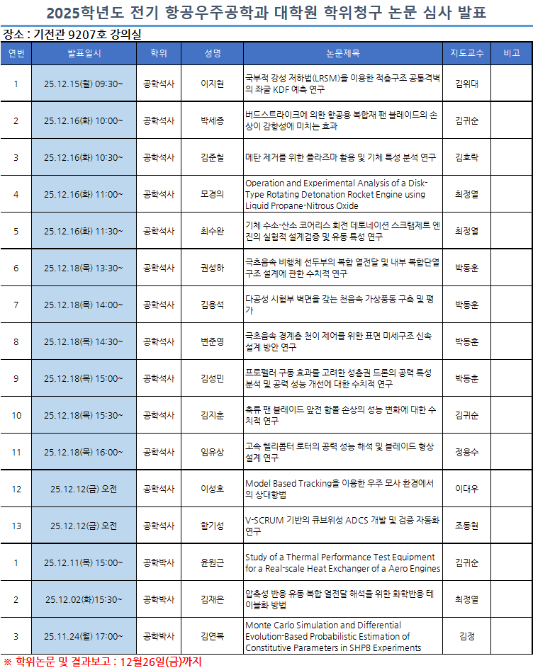 [대학원]2025학년도 전기 항공우주공학과 대학원 학위청구 논문 심사 발표 일자 안내
